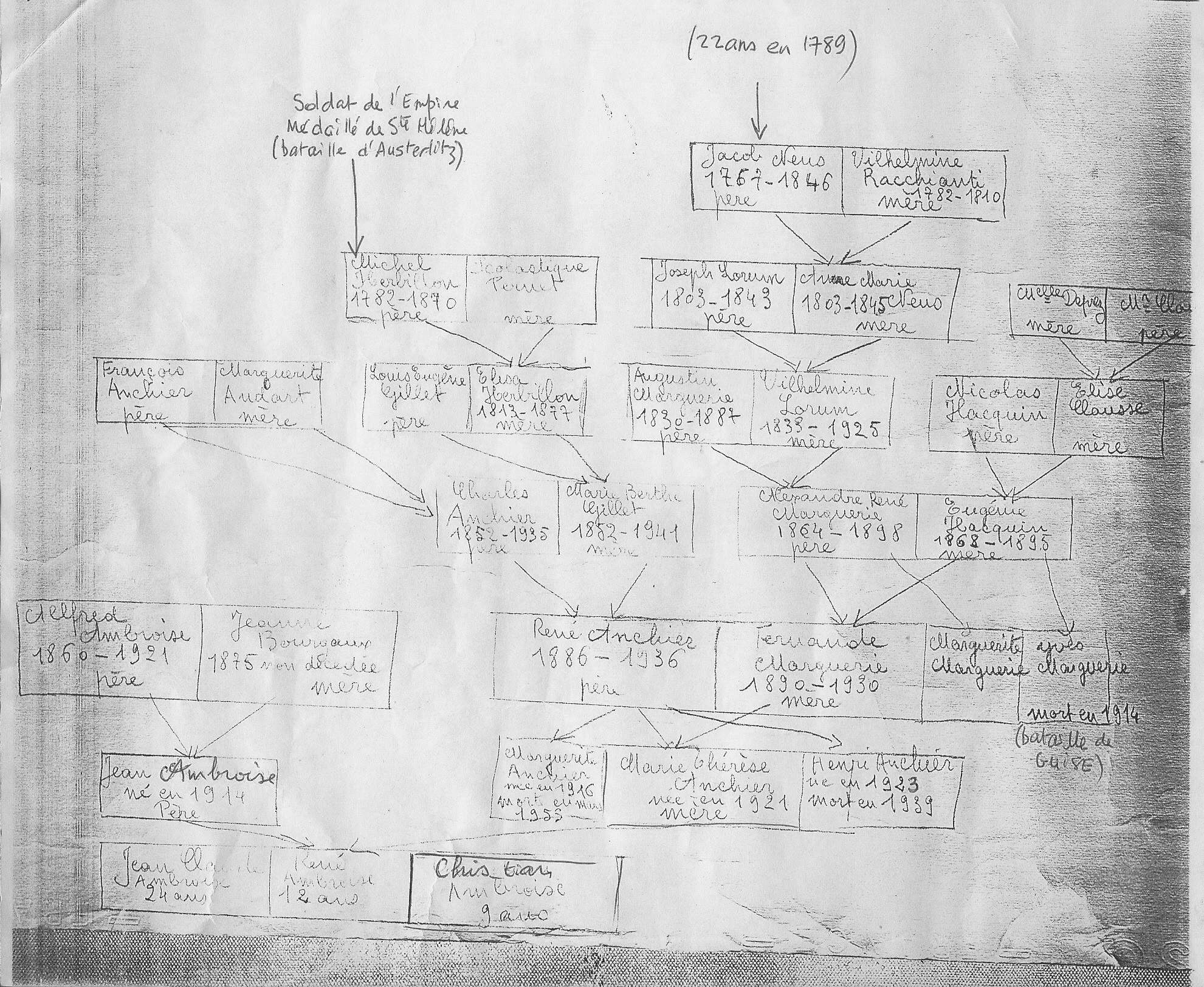 Alfred migre ensuite en Meuse, où il épouse Catherine Hissette, une femme d’origine alsacienne (Chapitre Alfred Ambroise (1861- ), Catherine Hissette (1868- ) et leurs enfants). Le couple a au moins cinq fils, et nomme leur premier enfant… Alfred. Ce dernier épouse une femme plus âgée que lui : elle a 37 ans, lui 30. Leur fils Jean (Alfred) Ambroise, mon grand-père grandit à Mont-Saint-Martin. Militaire à Bar-le-Duc, il y croise le chemin de Marie-Thérèse Anchier, alors âgée de 16 ans — de leur amour naîtra bientôt un enfant.