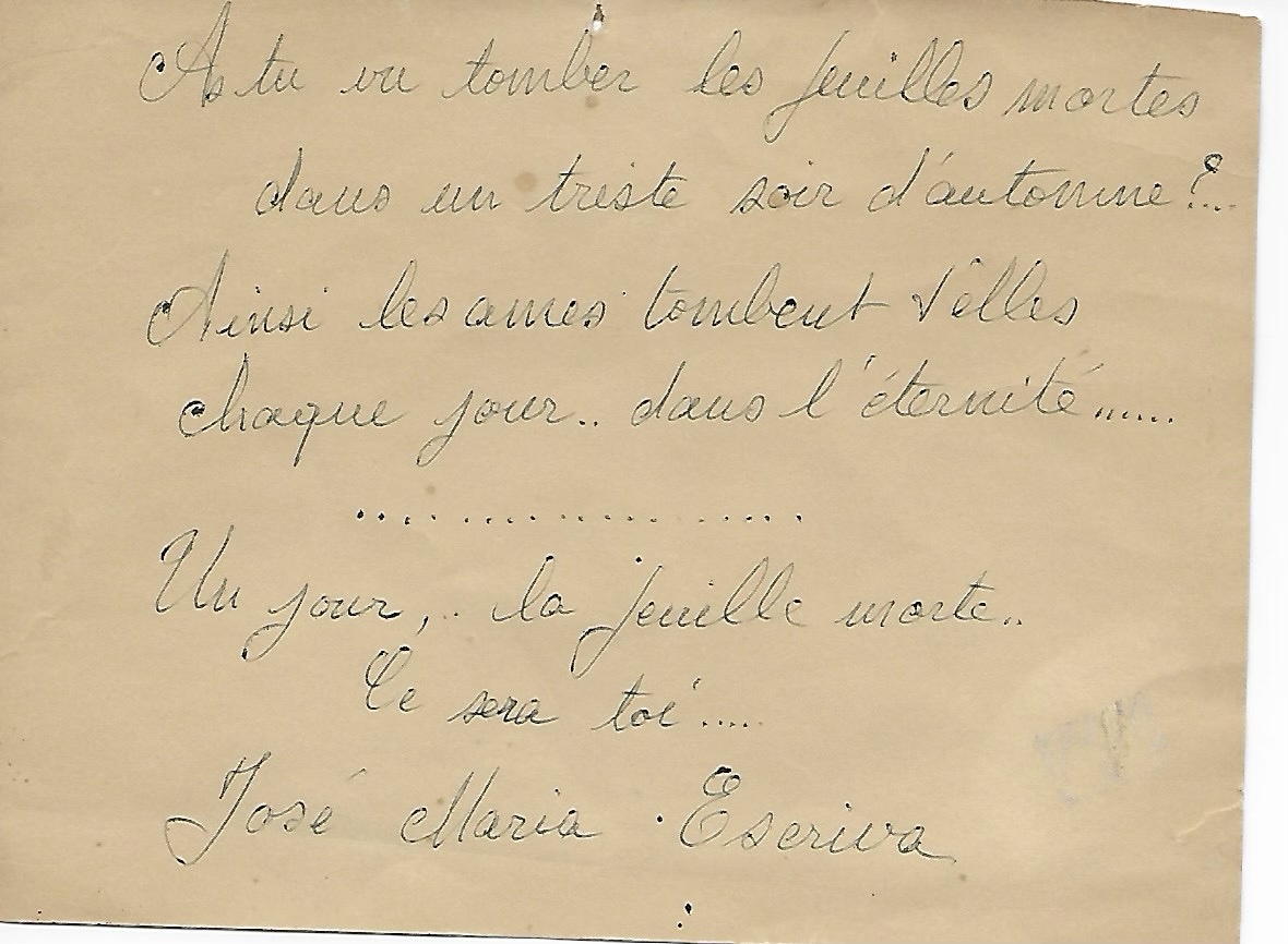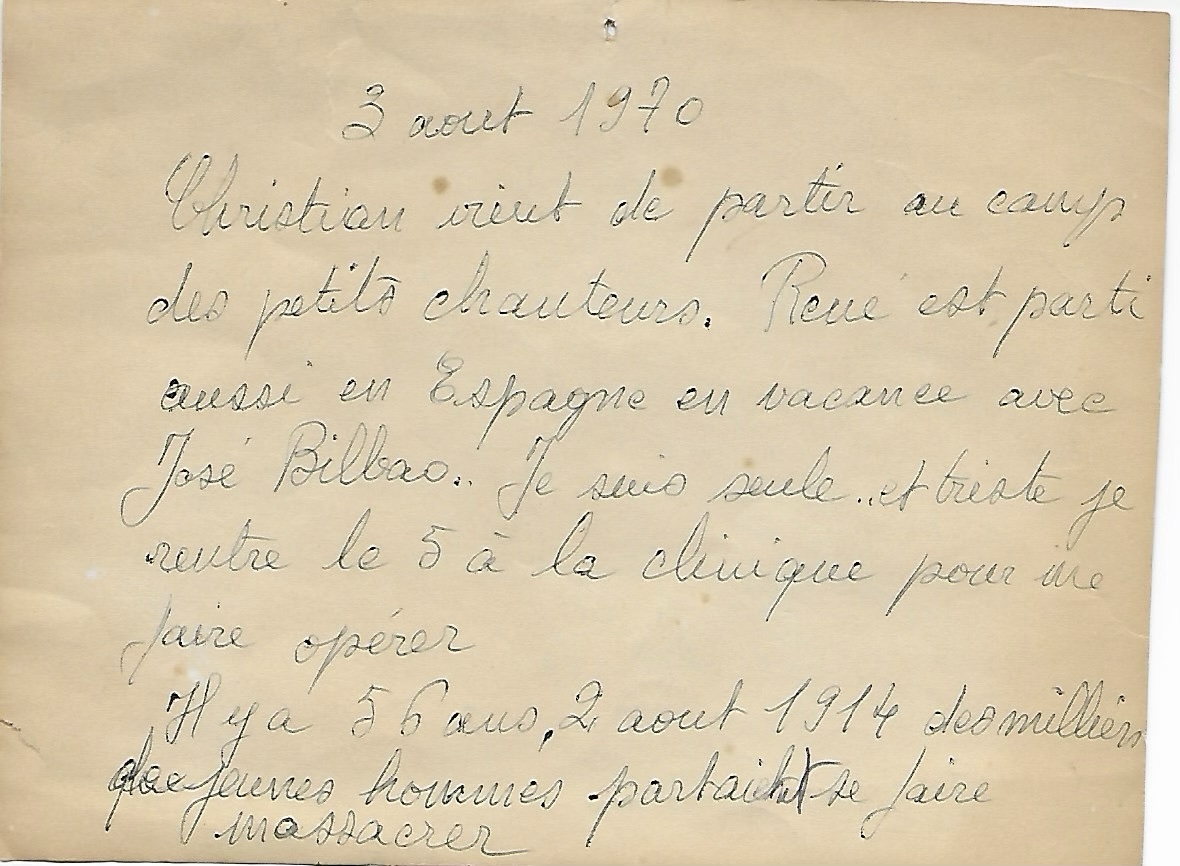 Chacun des trois enfants eut à souffrir de cette situation, et pour moi la coupe fut pleine quand, vers 17 ans, je fus obligé de séparer ces deux parents en train d’en venir aux mains. Heureusement, petits, nous pouvions profiter de notre grand jardin (et de l’immense parc attenant, propriété de vacances d’une famille parisienne) pour nous évader de cette ambiance souvent pesante et donner libre cours à nos aventures enfantines. Maman, une femme romantique, qui aurait sans doute été plus à son aise au siècle précédent le sien, avait aussi cette manie de la note, de l’écrit fugace : une impression griffonnée en marge d’un livre, un état d’âme sur un morceau de papier, une information au dos d’une photo pour la postérité. Je dois dire que toutes ces notes servent, m’ont servi à mieux la comprendre.