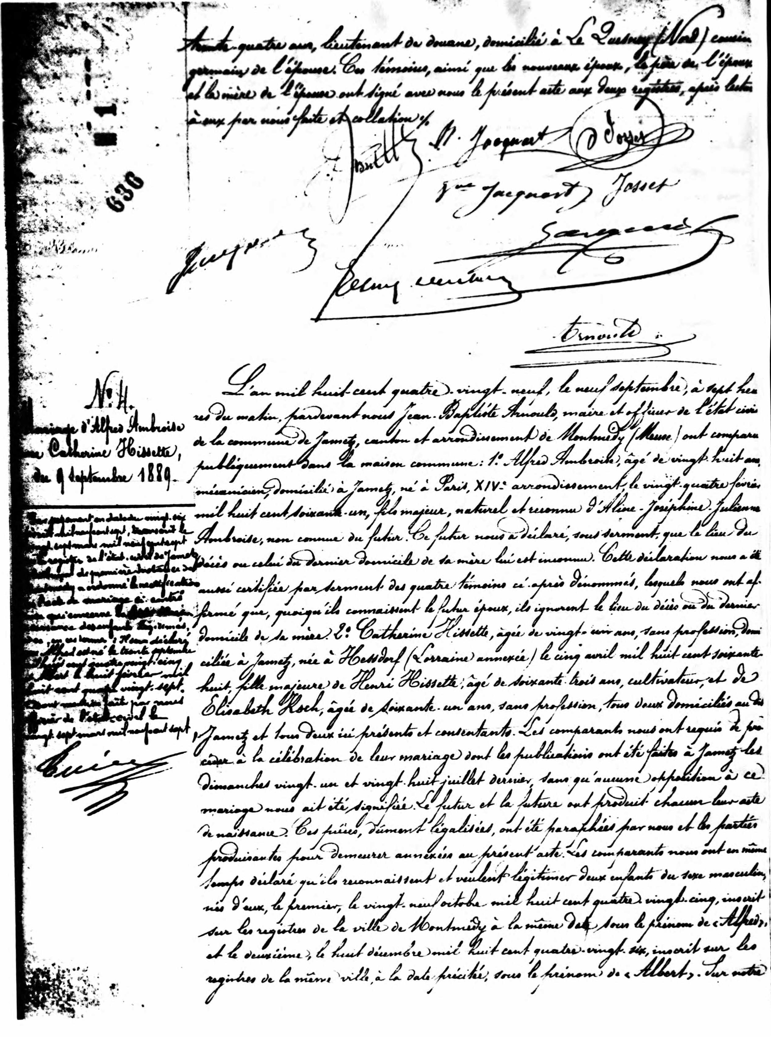 L’an 1889, le 9 septembre à 7h du matin. Par devant-nous. Jean-Baptiste, Arnould, maire et officier de l’État de la commune de Jametz, canton et arrondissement de Montmédy (Meuse), ont comparu publiquement dans la maison commune : 1. Alfred AMBROISE, âgés de 28 ans, mécanicien, domicilié à Jametz, né à Paris, 14e arrondissement, le 24 février 1861, fils majeur, naturel et reconnu d’Aline, Joséphine julienne Ambroise, non connue du futur. Ce futur nous a déclaré sous serment que le lieu du décès ou du dernier domicile de sa mère lui est inconnu. Cette déclaration nous a été aussi certifié par serment des quatre témoins, si, après dénommé, lesquels nous ont affirmé que, quoi qu’il connaisse, le futur époux, ils ignore le lieu du décès ou du dernier domicile de sa mère. 2. Catherine, Hissette âgé de 29 ans sans profession Celia à jamais né à Hessdorf (Lorraine annexée) le 5 avril 1860, huit, fille majeure de Henry Hissette, âgé de 63 ans, cultivateur et d’Elisabeth Koch, âgé de 61 ans, sans profession, tout deux domiciliés à Jametz, tout deux ici présent et consentant. Les comparants nous ont requis de procéder à la célébration de leur mariage dont les publications ont été faites à Jametz les dimanches 21 et 28 juillet dernier, sans qu’aucune opposition à ce Mariage nous ait été signifiée. Le futur et la future ont produit chacun leur acte de naissance. Ces pièces, dûment légalisées, produisantes pour demeurer annexées au présent acte. Les comparants nous ont en même temps déclaré qu’ils reconnaissent et veulent légitimer deux enfants du sexe, nés masculin né d’eux, le permier le 29 octobre 1885, inscrit sur les registres de la ville du Montmédy, à la même date sous le prénom de Alfred et le deuxième, le 8 décembre 1886, inscrit sous les registres de la même ville à la date, précisée sous le prénom d’Albert…