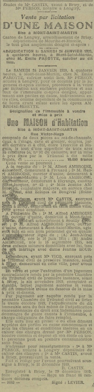 Le samedi 24 janvier 1920, à 14 heures, à Mont-Saint Martin, une vente par licitation a eu lieu à Mont-Saint-Martin (Meurthe-et-Moselle) concernant une maison appartenant à la communauté de biens ayant existé entre Alfred Ambroise et Catherine Hissette, tous deux décédés.