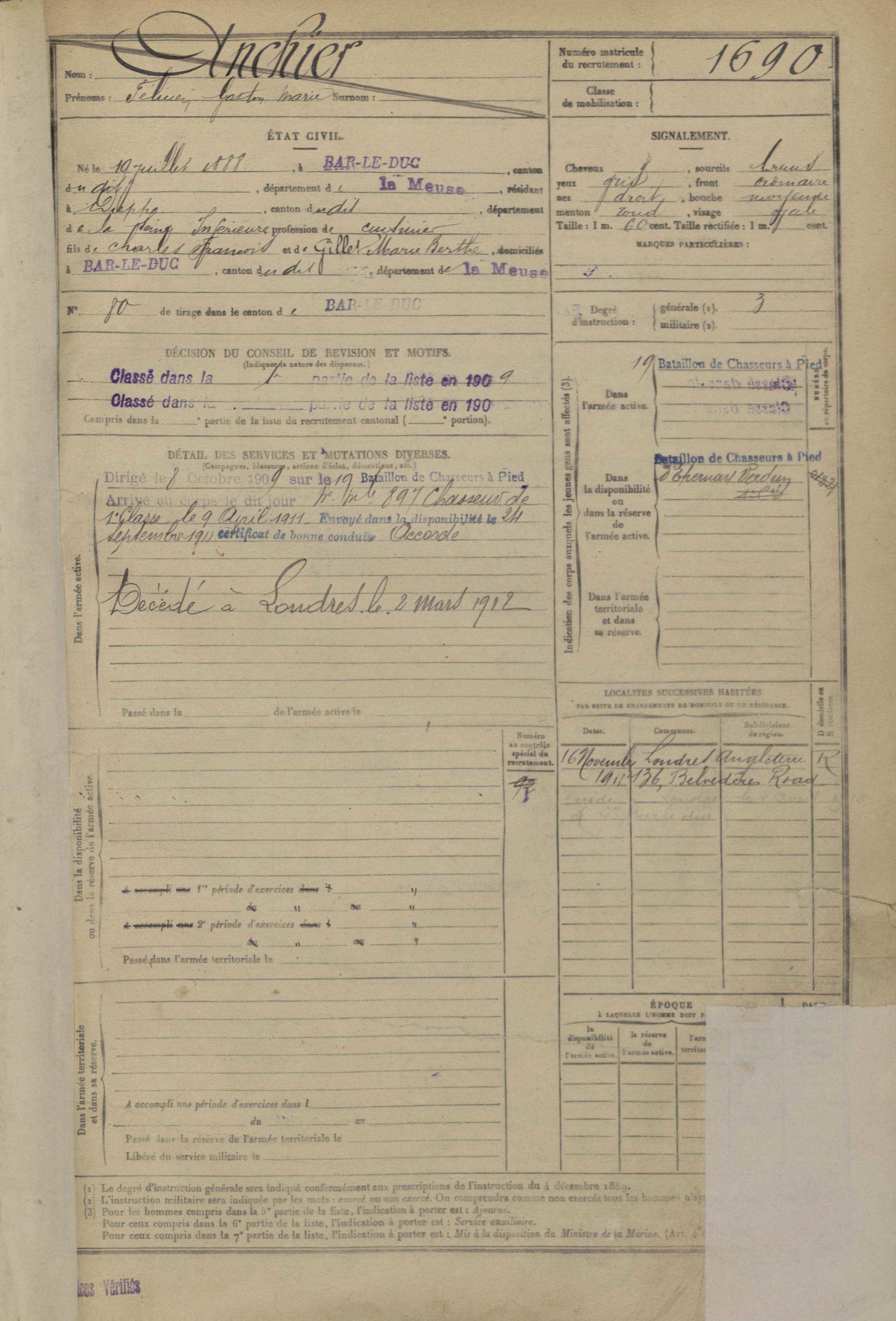 - arrivé le 8 octobre 1907 sur le 19ème régiment des bataillons de chasseurs à pied